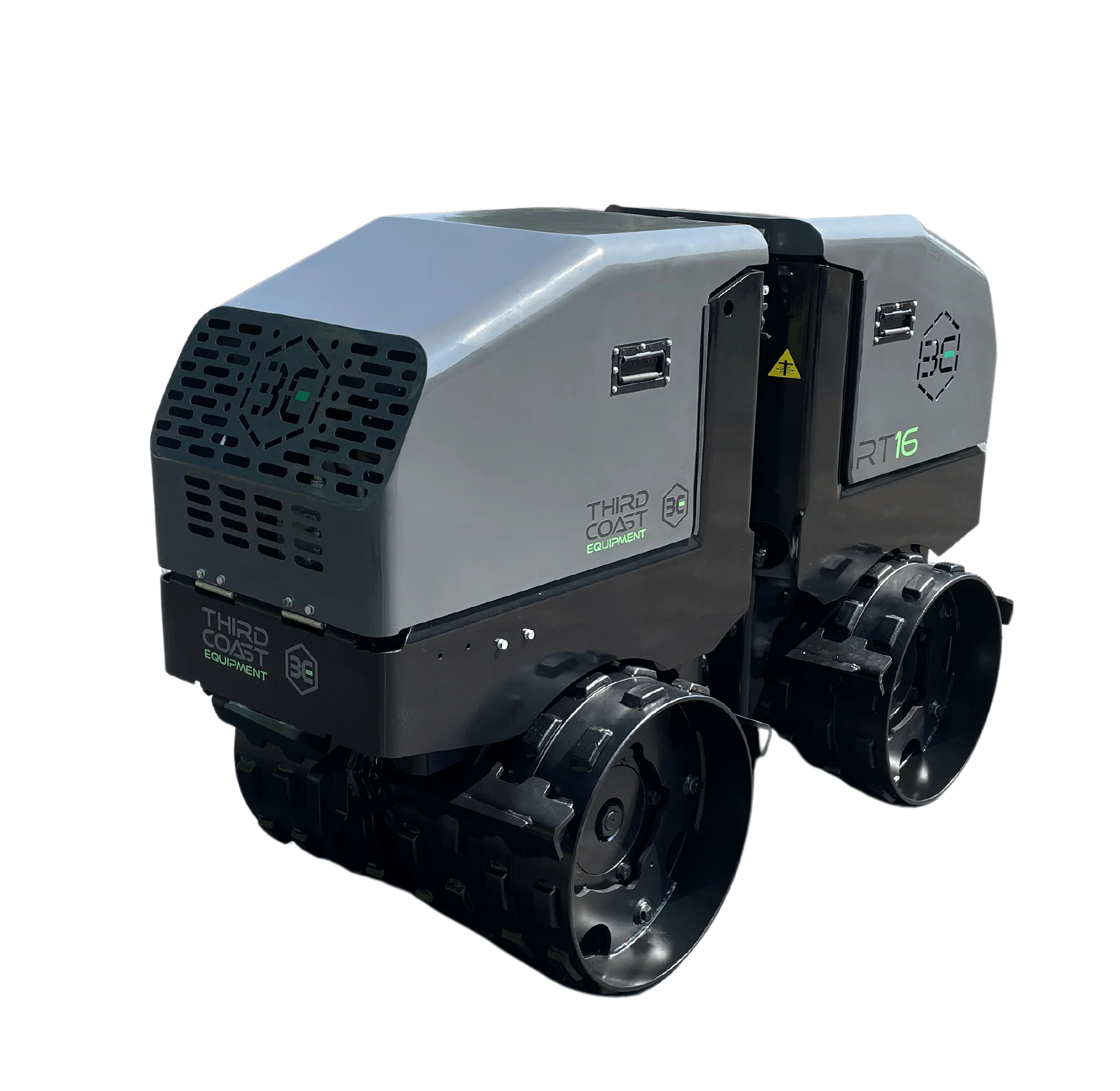 The Third Coast Equipment RT16 trench roller delivers high-performance compaction for trenches, foundations and confined jobsites. Featuring remote-control operation and expandable padfoot drums, it provides strong compaction in cohesive soils. Powered by a 20 HP Yanmar diesel engine with up to 15,300 lbf centrifugal force, its articulated design and rugged steel construction ensure safe, efficient and reliable jobsite performance.